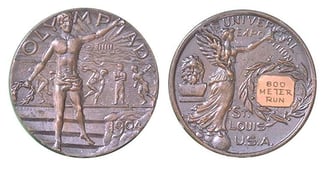 Bearing the inscription “Olympiad, 1904”, one side shows a victorious athlete and on the other side, Nike, the ancient Greek goddess of victory.