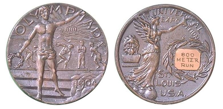С надписью «Олимпиада, 1904», с одной стороны изображен победивший атлет, а с другой стороны — Ника, древнегреческая богиня победы.